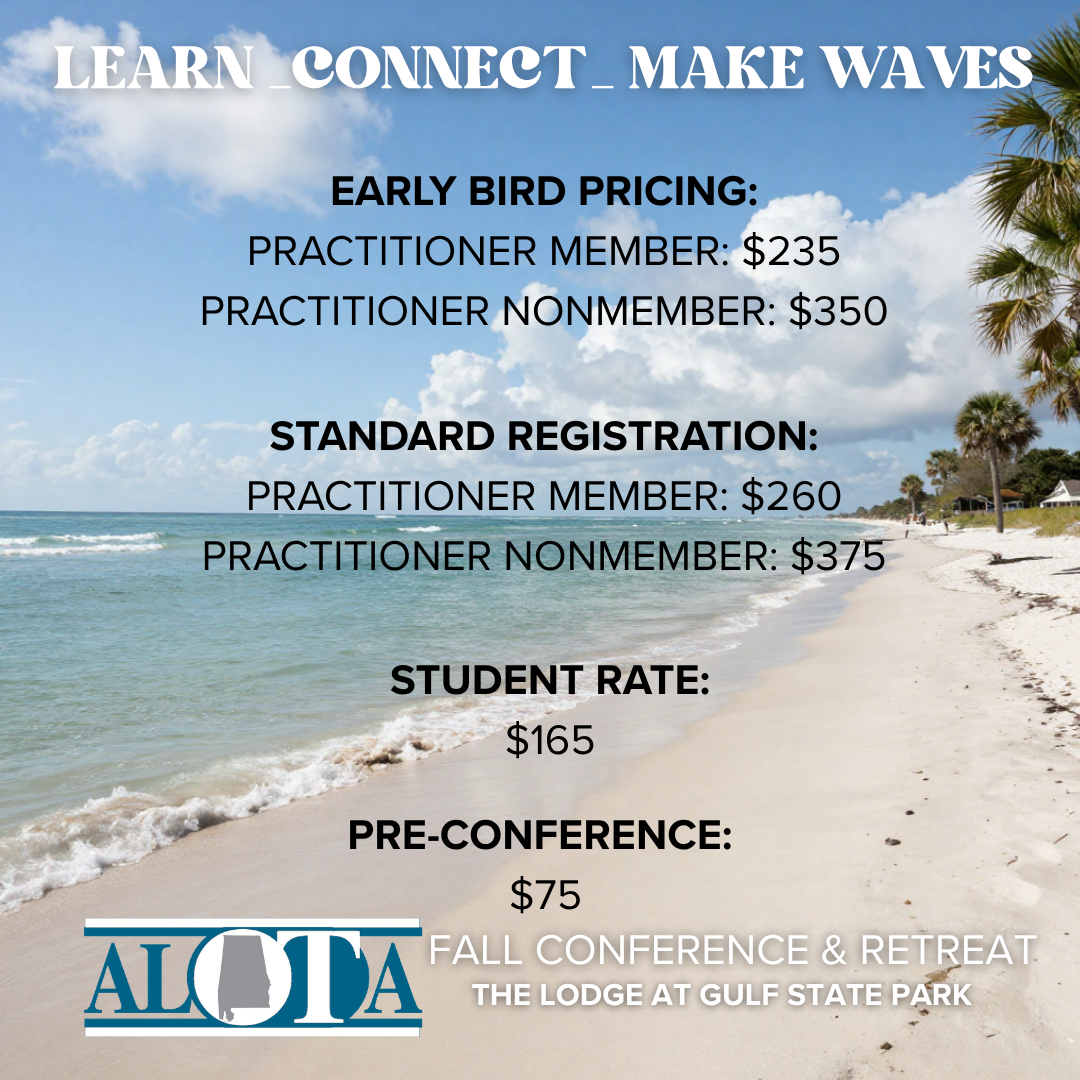 Join us for an unforgettable weekend of learning, connection, and rejuvenation at the 2026 ALOTA Fall Conference & Retreat. Set against the beautiful backdrop of Alabama’s Gulf Coast, this special event brings together occupational therapy professionals from across the state and beyond for meaningful professional development, collaboration, and networking.